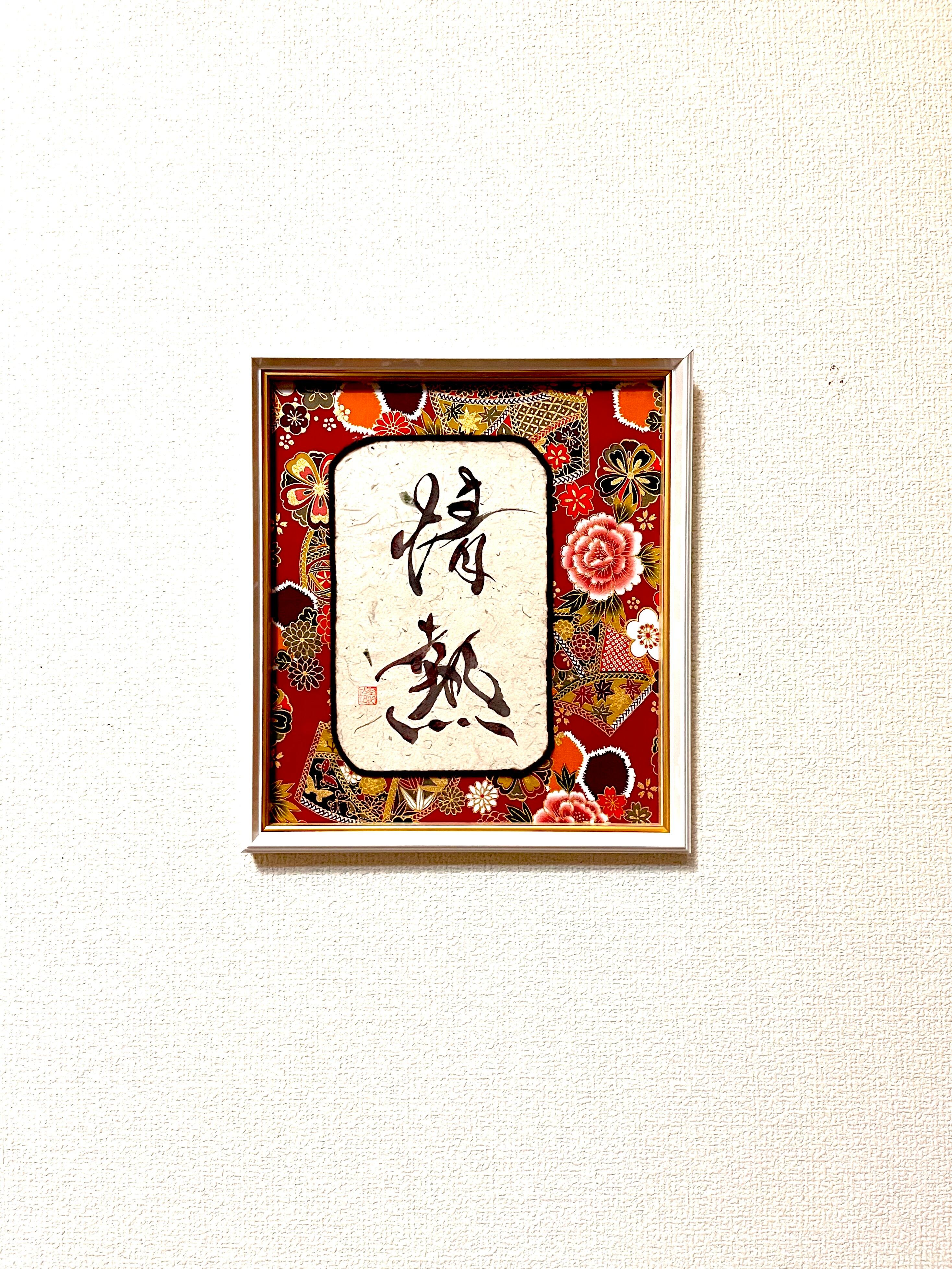 情熱の赤の和柄で文字にも赤色を混ぜて書いた作品です。