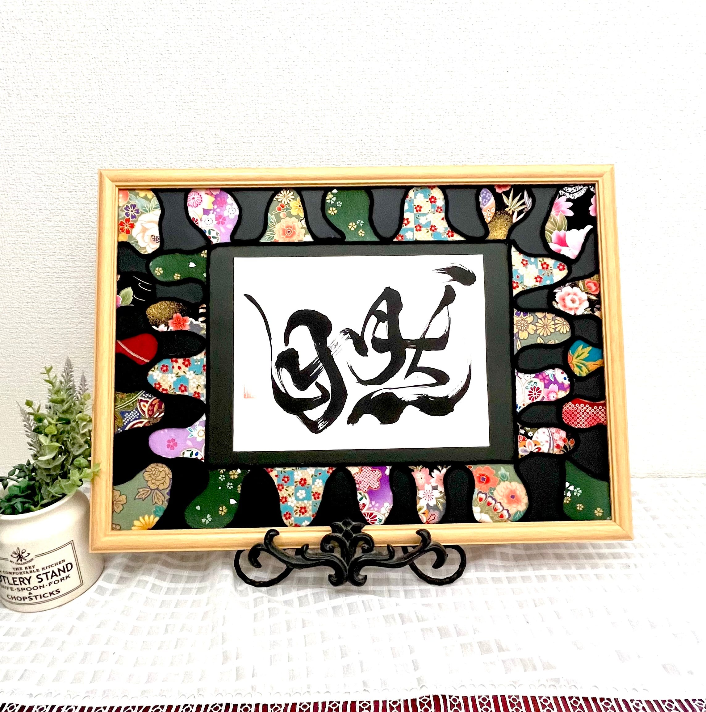 着物柄を用いた、和風で華やかに書を引き立ててくれるオリジナルの作品「和柄アート」です。
