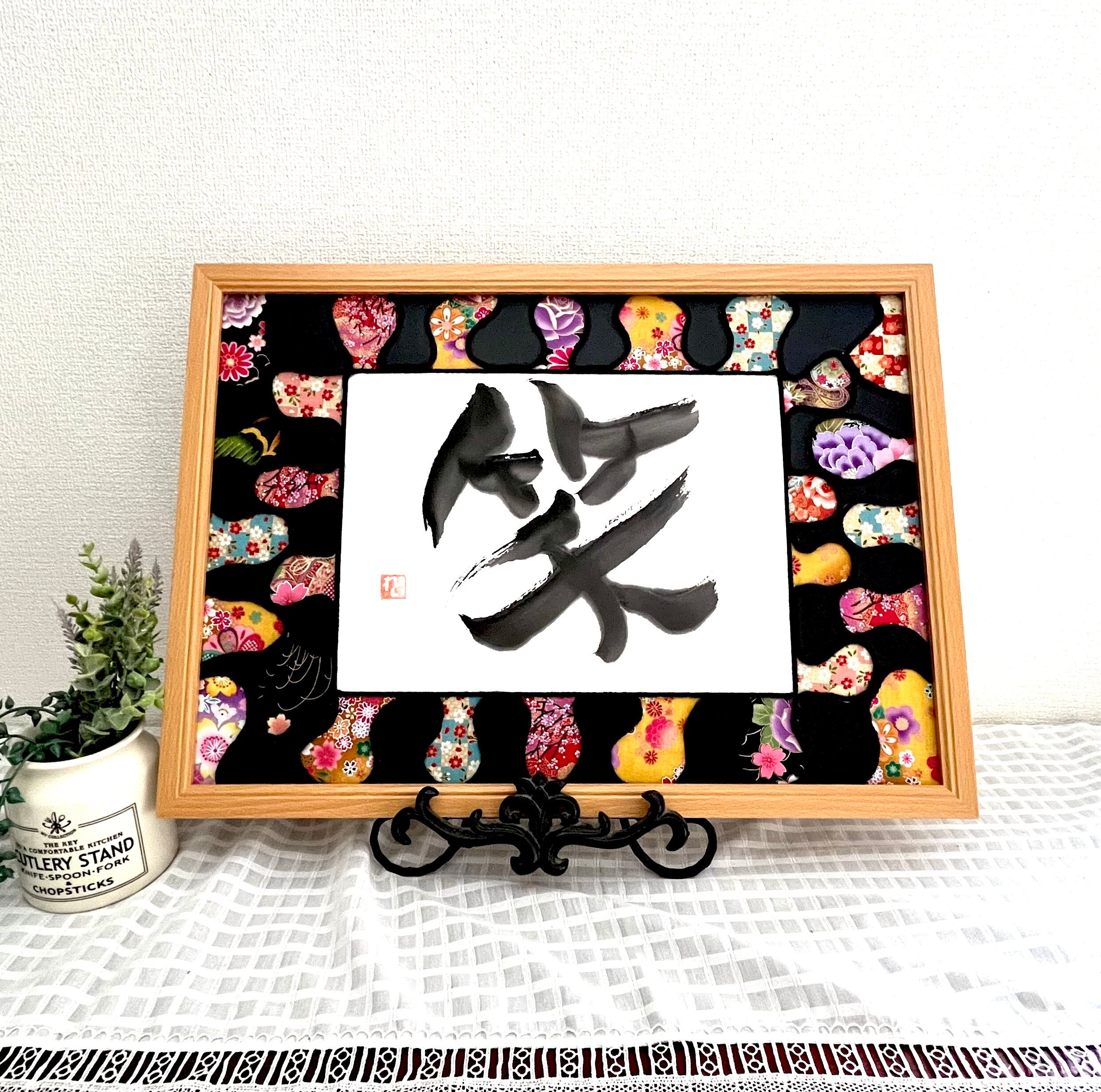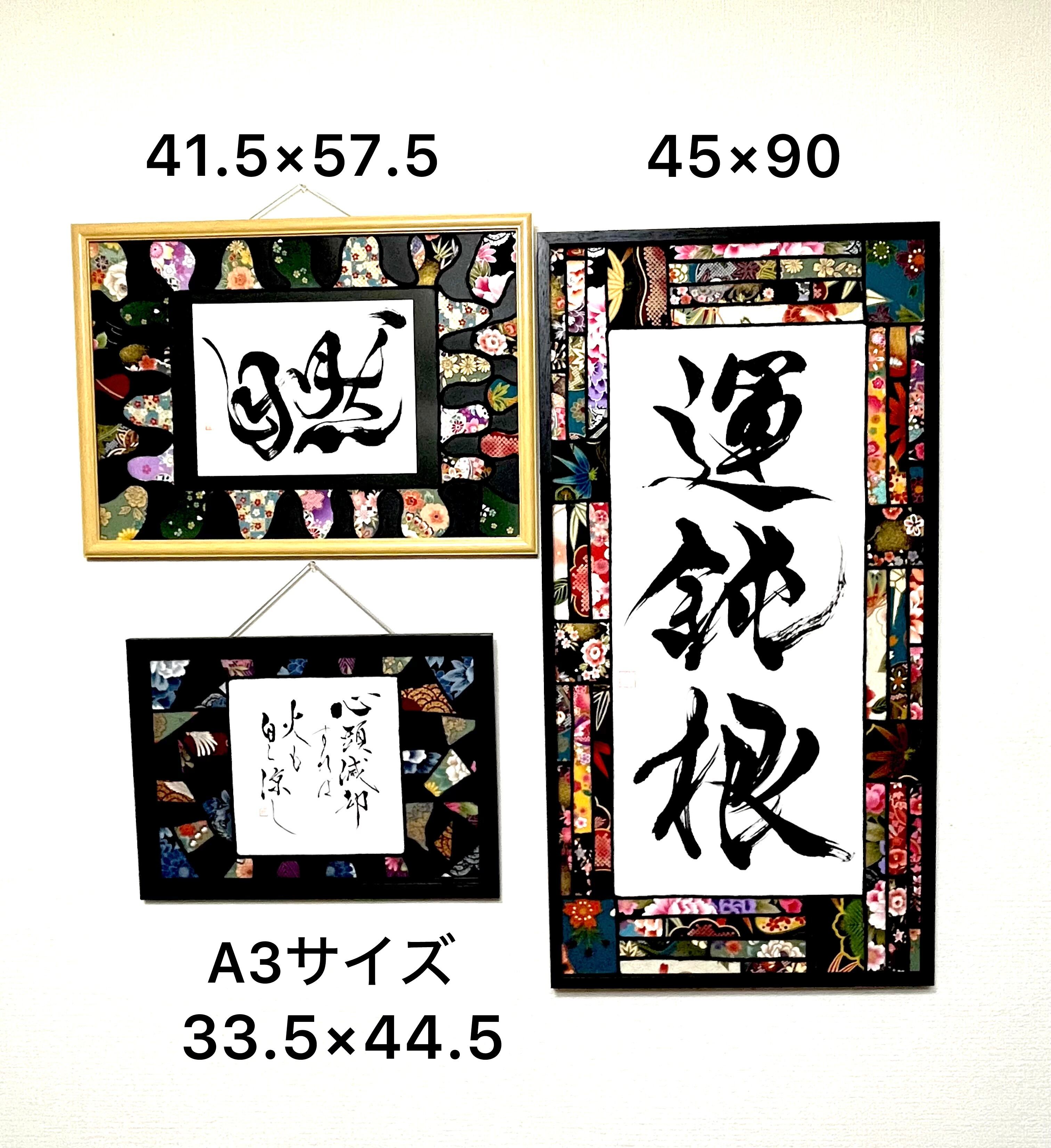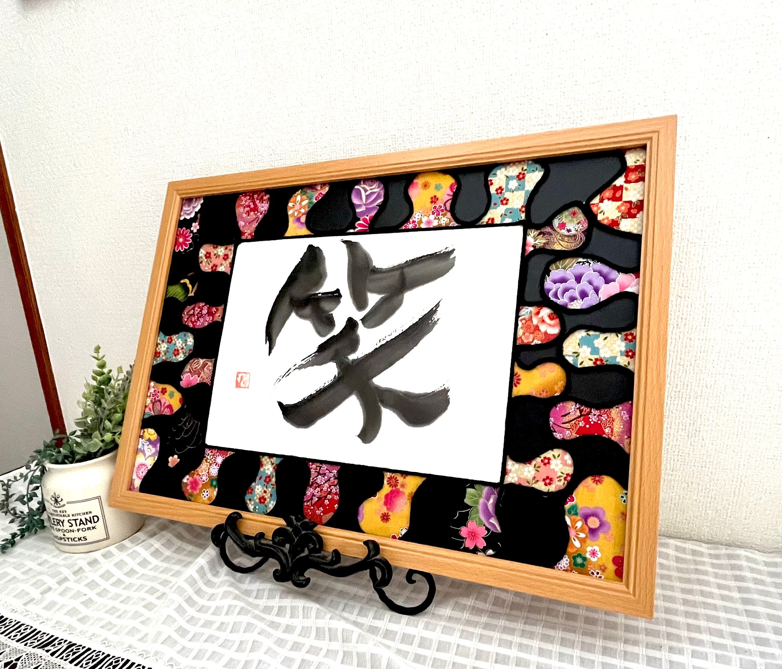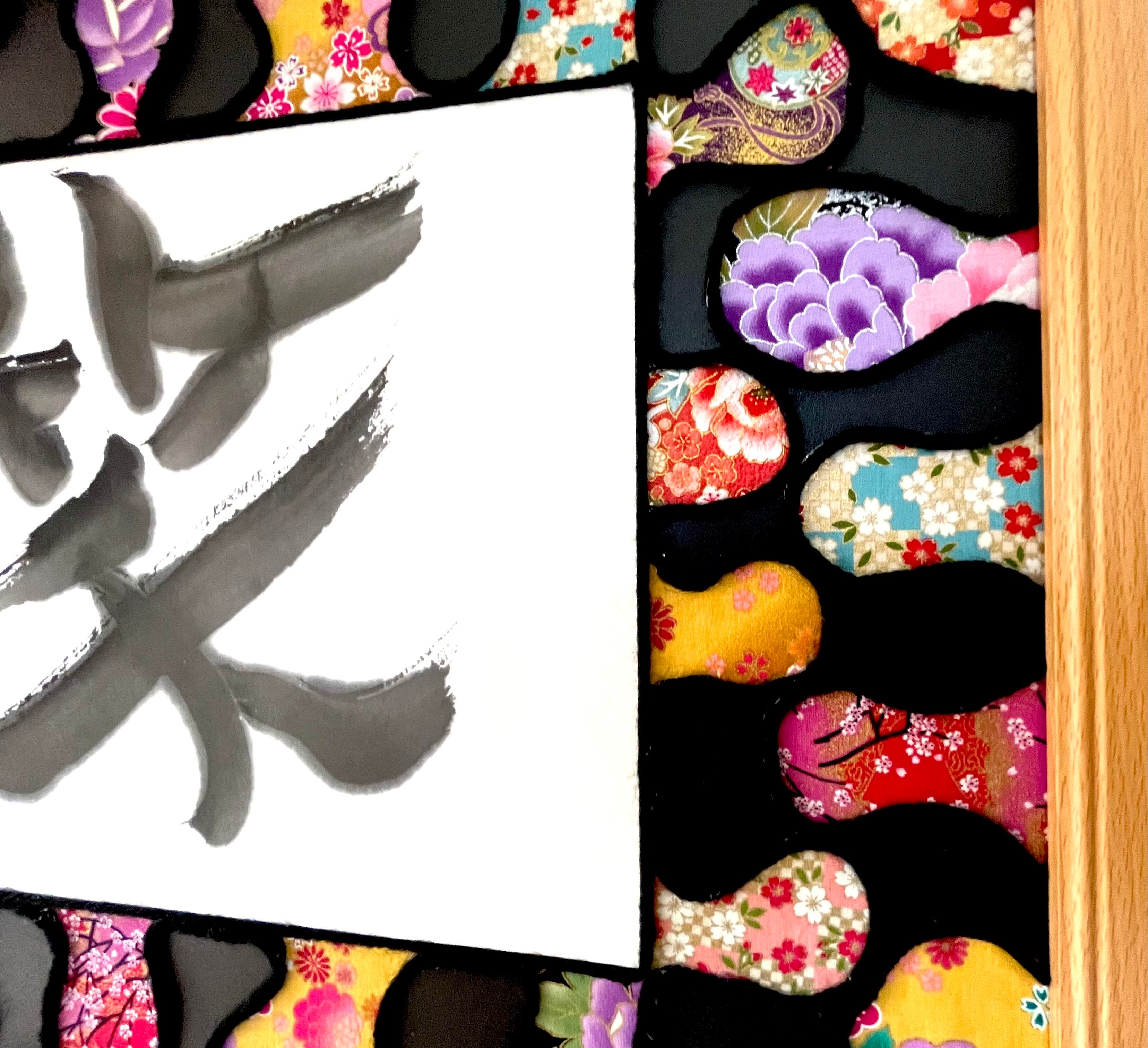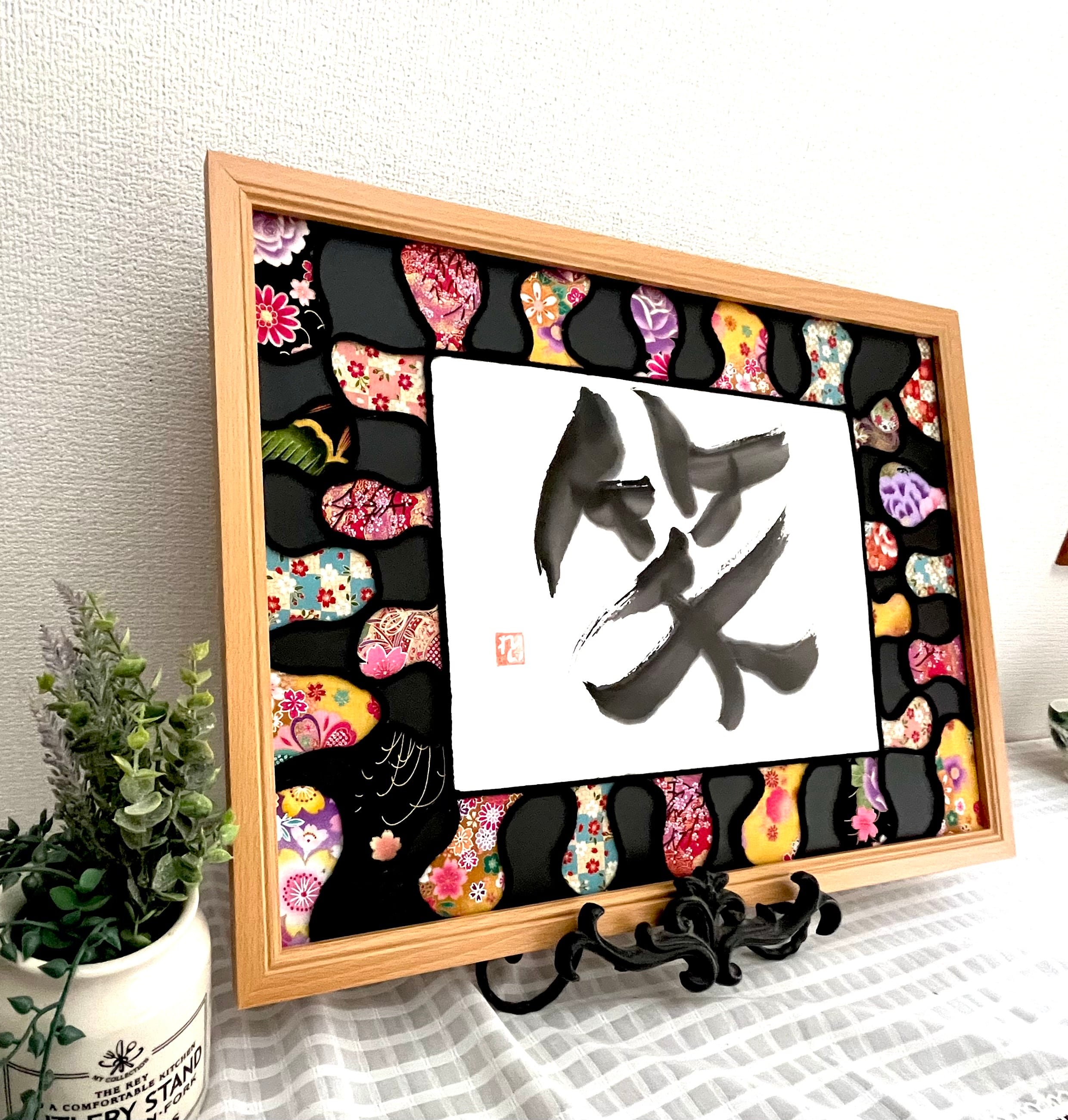 着物柄を用いた、和風で華やかに書を引き立ててくれるオリジナルの作品「和柄アート」です。
