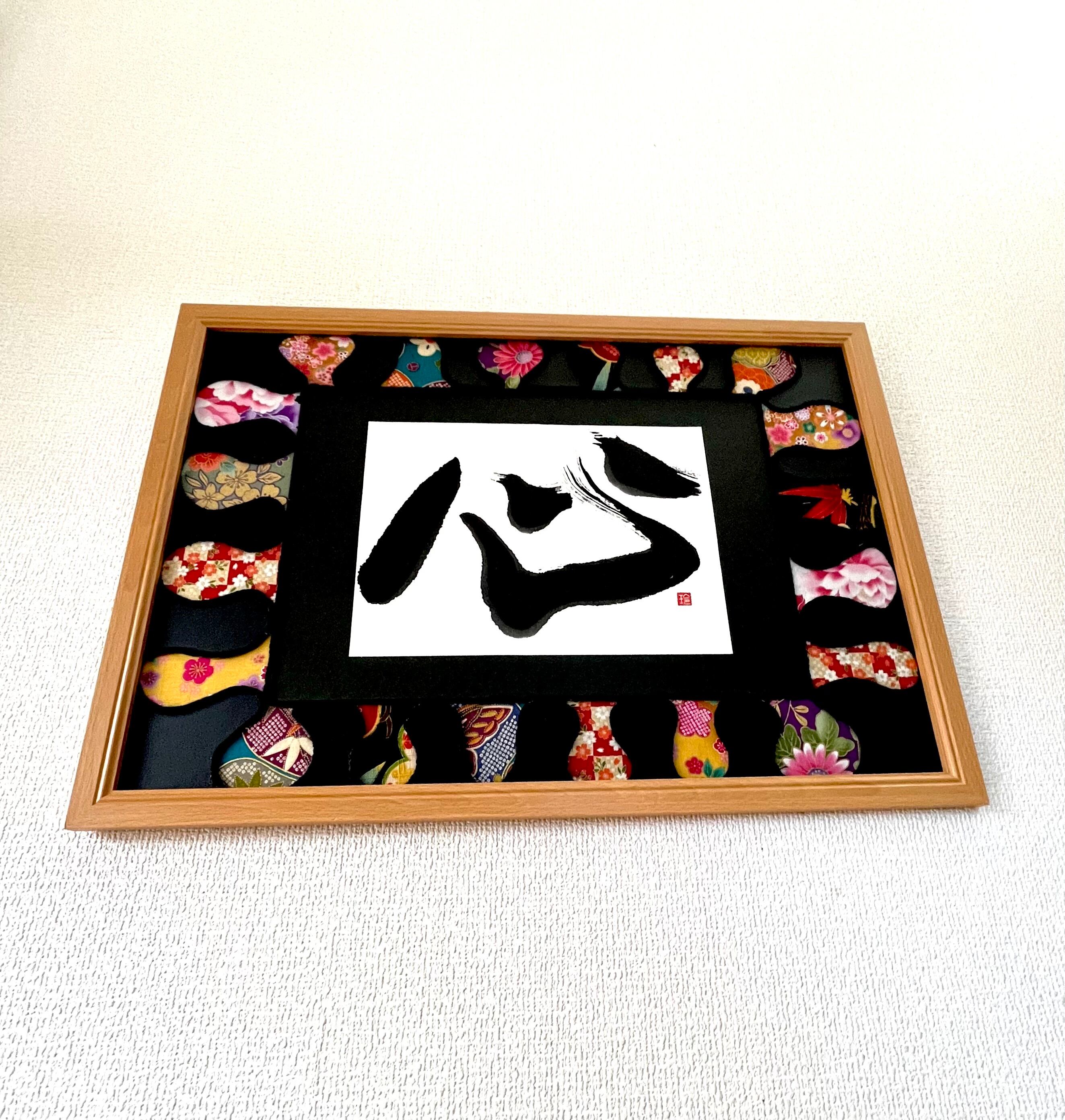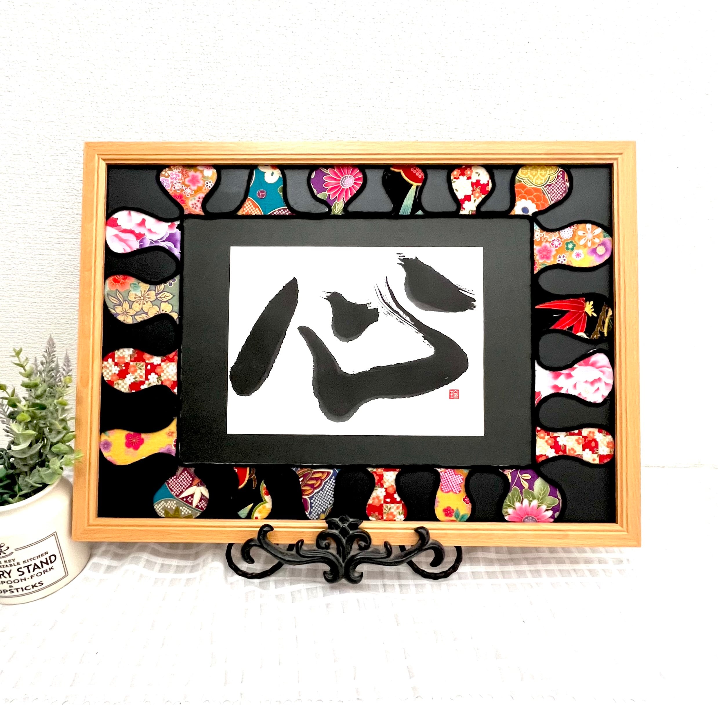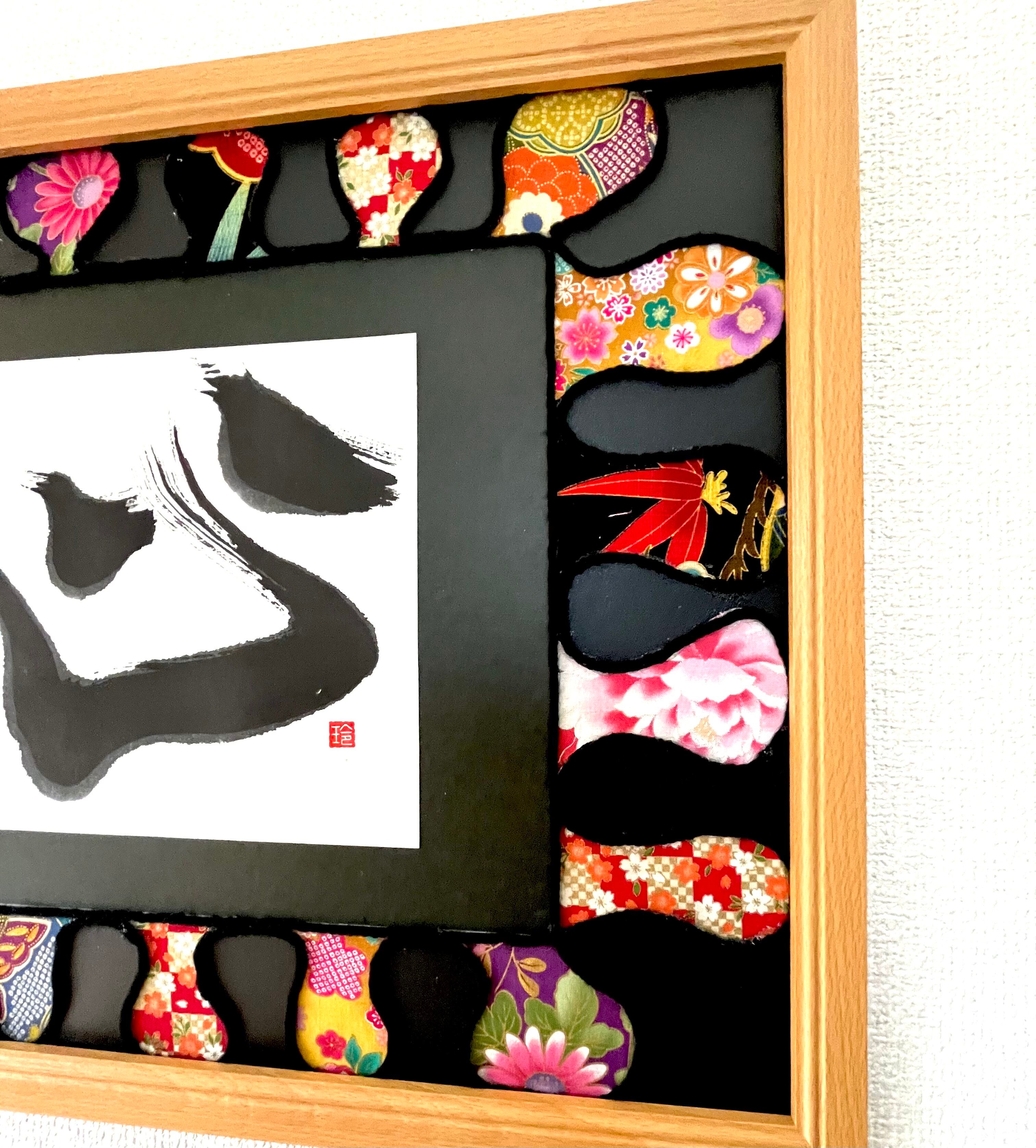 着物柄を用いた、和風で華やかに書を引き立ててくれるオリジナルの作品「和柄アート」です。